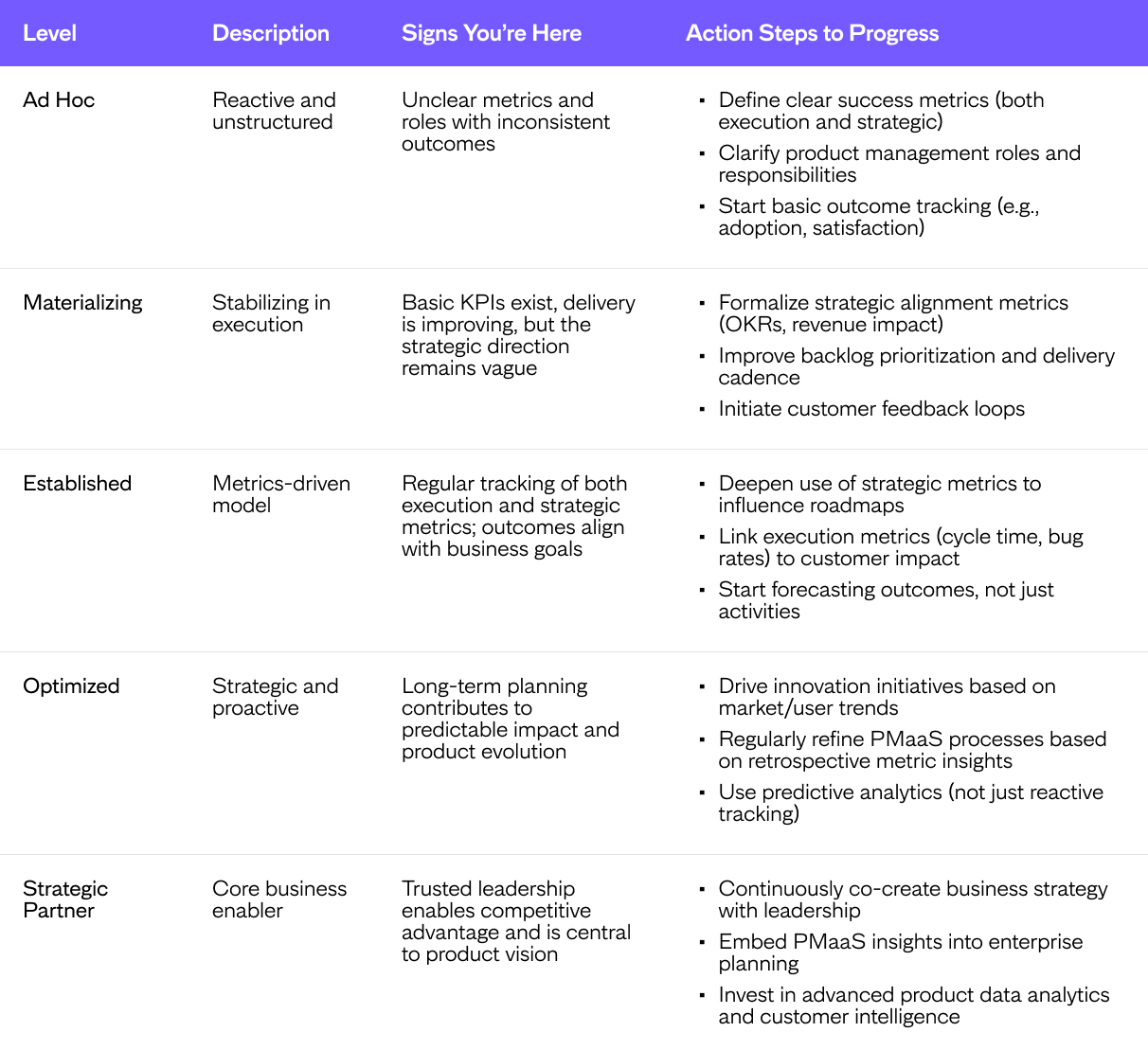 Our structured PMaaS maturity model below shows a staged view of how organisations can evolve from reactive execution to embedded, strategic product leadership.